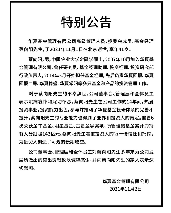 财联社11月2日讯,知名基金经理蔡向阳去世,对此消息,财联社已从华夏基金方面得到证实,“太无常了!”。特别公告中提到,华夏基金管理有限公司高级管理人员、投委会成员、基金经理蔡向阳先生,于2021年11月1日在北京逝世,享年41岁。蔡向阳为中国农业大学金融学硕士,2007年10月加入华夏基金管理有限公司,曾任研究员、基金经理助理、投资经理、投资研究部行政负责人,2014年5月开始担任基金经理,先后负责华夏回报、华夏回报二号、华夏稳盛、华夏常阳等多只基金和产品的投资管理工作。对于蔡向阳先生的不幸辞世,公司董事会、管理层和全体员工表示沉痛哀悼和深切怀念。蔡向阳先生在公司工作的14年间,热爱投资事业,投资能力出色,参与并推动了华夏基金投研体系的完善和提升。蔡向阳先生的专业能力也得到了业界和投资人的肯定。他曾6次荣获金牛基金、明星基金、金基金等奖项,所管理的基金累计为持有人分红超142亿元。蔡向阳先生看重投资人的每一份信任和托付,为投资人创造了可观的长期收益。公司董事会、管理层和全体员工对蔡向阳先生多年来为公司发展所做出的突出贡献致以诚挚感谢,并向蔡向阳先生的家人表示深切慰问。三季度末,蔡向阳管理基金资产总规模472.82亿元。