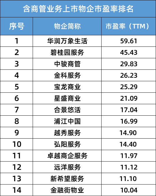 商管类物企也正迎来新一轮洗牌,14家含商管业务的物企在管面积排位发生明显变化,资本市场估值差距也在逐渐拉大。截至2021年10月29日,上市港股物企首尾相差57.7,平均PE为18.6,而典型的几家商管类物企业,如华润万象生活、宝龙商业、星盛商业、中骏商管等均高于物企平均PE值。