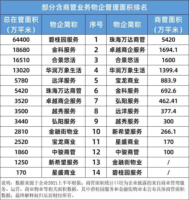 乐居财经统计了14家公布商管面积的物企,其中包含刚刚递表的万达商管。根据商管面积排名,万达商管以5420万平米的在管规模一骑绝尘。