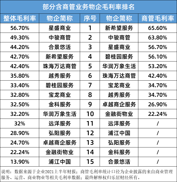 在没有住宅物业毛利率的拉低下,凭借较高的商管毛利率,星盛商业整体毛利率在上述15家物企中排名首位。
