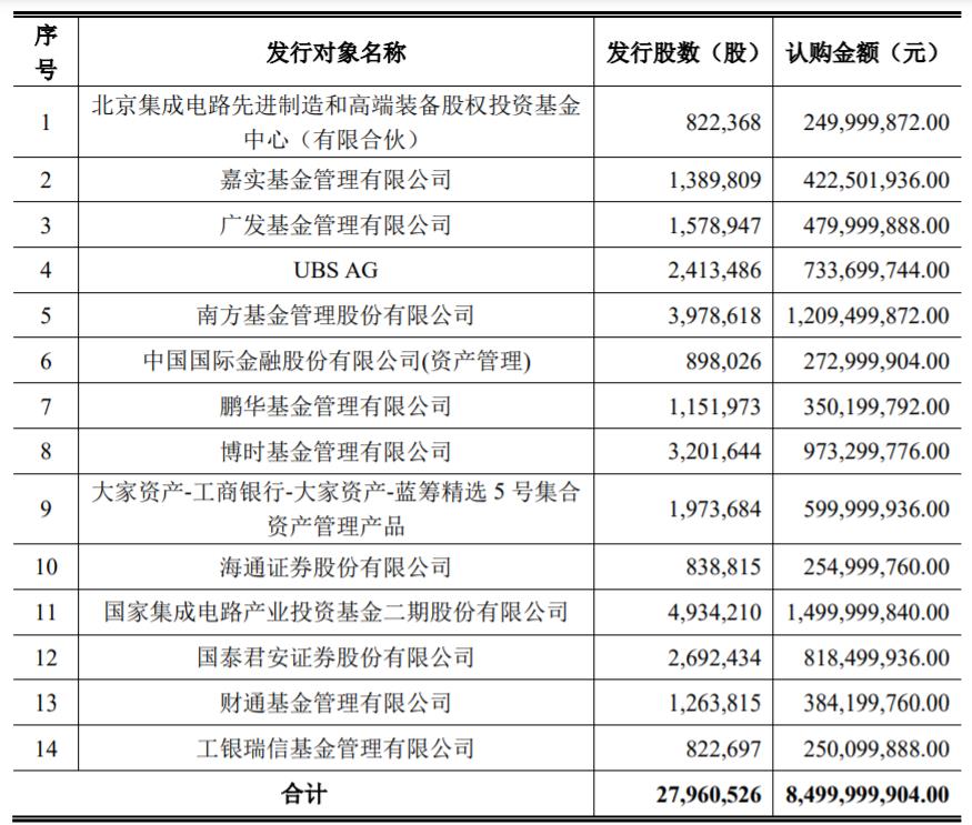 财联社11月2日电,北方华创发布定增情况报告书,本次发行价格304元/股,募资总额近85亿元,其中大基金二期认购近15亿元,UBS认购近7.34亿元,北京集成电路先进制造和高端装备股权投资基金中心认购近2.5亿元。
