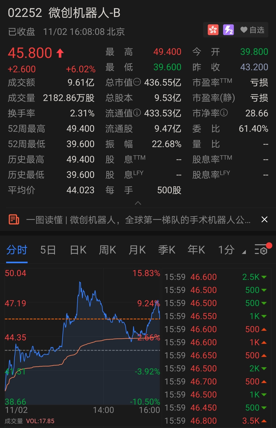 11月1日的交易中,微创机器人于多家券商暗盘破发。其中,富途暗盘一度高开4.17%,随后转跌,最终收报40.05港元,较招股价跌7.3%,一手账面亏损1575港元;辉立暗盘则跌7.1%,一手亏损1525港元;耀才暗盘跌幅7.3%,与富途同样每手账面亏1575港元。11月2日新股首日延续了暗盘跌势,微创机器人开盘报39.8港元,低开7.87%,临近午间开始拉升,午盘收涨6.6%,午后开盘强势拉升,最高报49.4港元/股,较招股价涨超14.38%。