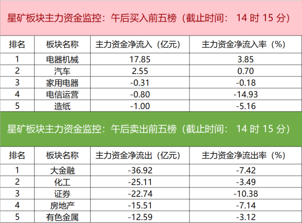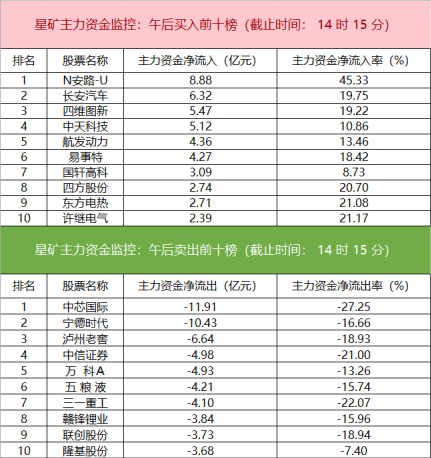 星矿主力资金监控:午后买卖前十榜