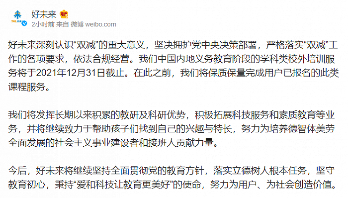 财联社11月13日电,好未来通过其官方微博发布声明:中国内地义务教育阶段的学科类校外培训服务将于2021年12月31日截止,将积极拓展科技服务和素质教育等业务。