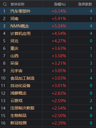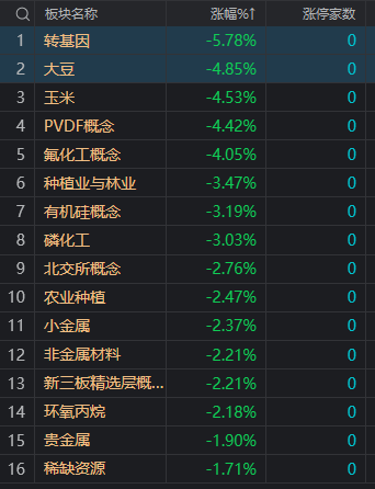 财联社11月15日电,两市早盘高开低走,创业板指跌幅扩大至1%,宁德时代等权重股继续走弱,指数黄白线分离严重。锂电、光伏、风电等新能源板块集体下挫,永太科技、东阳光等跌停;近期走强的农业板块回落,隆平高科等跌停。元宇宙概念股反复活跃,丝路视觉20CM涨停;汽车零部件板块有所分化,沪光股份盘中一度7连板;军工、券商等板块冲高回落。北交所今日开市,其中10只新股集体大涨,盘中均触发两次临停,N同心涨超500%居首;但71只精选层平移股票中,仅11股录得上涨。总体上个股涨多跌少,市场成交放量明显,沪深两市半日成交额超7600亿元。盘面上,汽配、NMN概念、食品加工、鸿蒙等板块涨幅前列,转基因、氟化工、有机硅、北交所概念等板块跌幅居前。截止午间收盘,沪指跌0.29%,深成指跌0.6%,创业板指跌1%。沪股通早盘净流入11.03亿,深股通早盘净流入24.43亿。