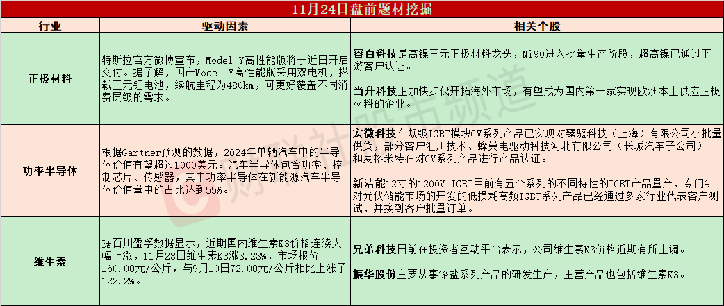 ①Model Y高性能版将交付,高镍三元材料再迎风口;②新能源车带动半导体需求大增,IGBT迎来广阔成长空间;③维生素K3价格连续大幅上涨,机构看好行业盈利修复机会。