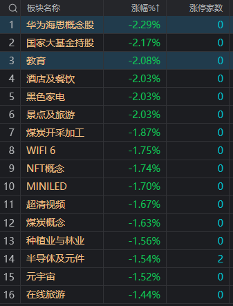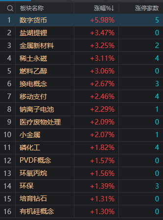 财联社11月26日电,两市午后继续弱势震荡,上证50指数一度跌超1%,中证1000指数小幅上涨,炸板股有所增多,市场情绪较为低迷。数字货币板块盘中大幅冲高领涨,旗天科技等多股封板;盐湖提锂、稀土永磁板块强势,银河磁体20CM涨停股价创新高。换电概念、磷化工、环保、钢铁等板块盘中拉升,煤炭、半导体芯片等板块低迷。总体上个股普跌,沪深两市成交额连续第26个交易日突破万亿。11连板的次新股镇洋发展今日跌停,国发股份疑遭“杀猪盘”连续3日跌停。盘面上,数字货币、盐湖提锂、稀土永磁、换电概念等板块涨幅前列,华为海思、教育、景点旅游、煤炭等板块跌幅居前。截止收盘,沪指跌0.56%,深成指跌0.34%,创业板指跌0.16%。北向资金全天净卖出超40亿元,此前连续5个交易日净买入。