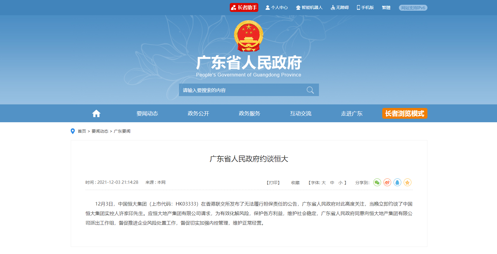 广东省人民政府约谈恒大