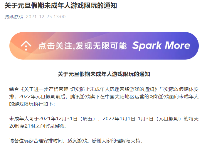 财联社12月25日电,腾讯游戏发布通知称,2022年元旦假期前后,腾讯游戏旗下在中国大陆地区运营的网络游戏面向未成年人的游戏限玩执行如下:未成年人可于2021年12月31日(周五)、2022年1月1日-1月3日(元旦假期)的每天20时至21时之间登录游戏。