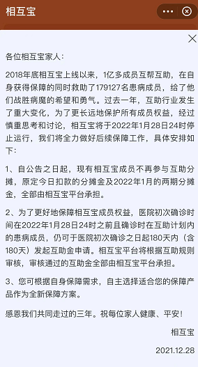 相互宝公告:将于明年1月28日关停