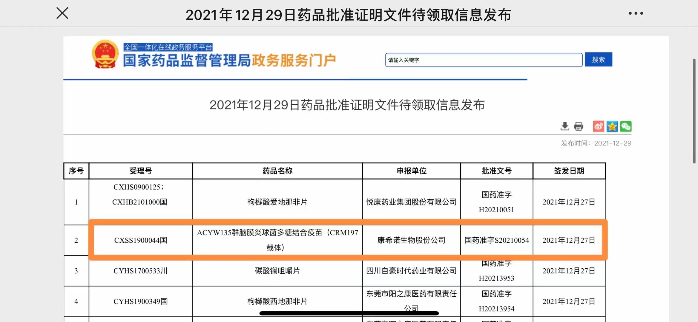 康希诺四价脑膜炎结合疫苗MCV4获批上市 为国内首个