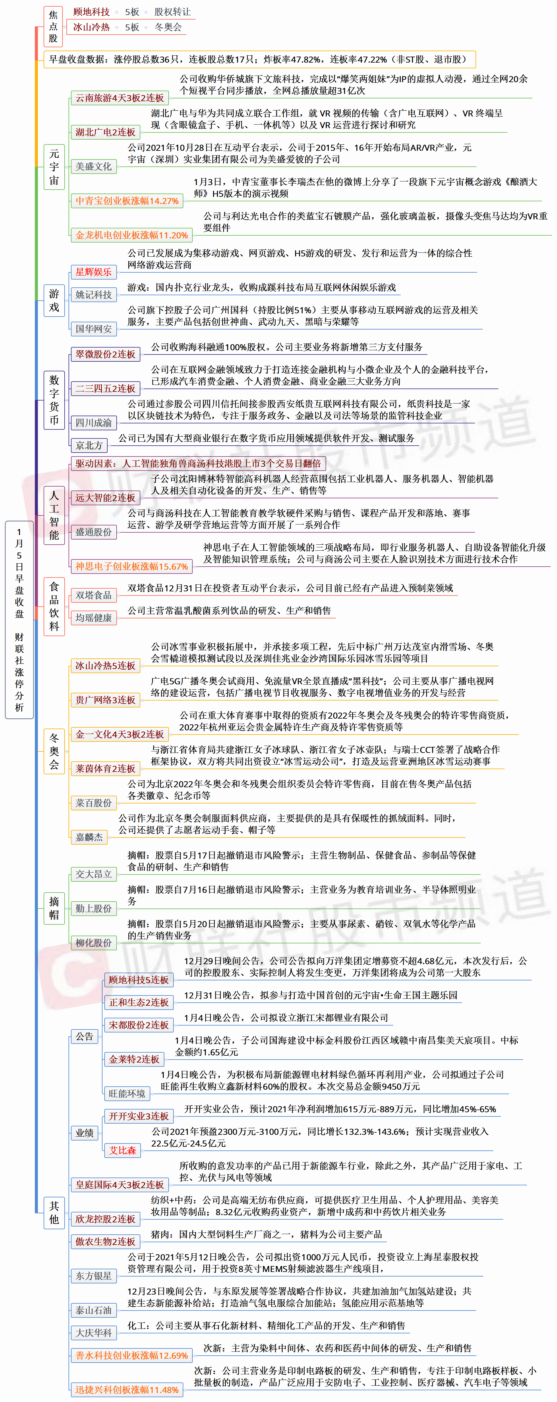 今日午盘两市共36股涨停,连板股总数17只,33股封板未遂,封板率为52%(不含ST股、退市股及未开板新股)。个股方面,股权转让的顾地科技5板,冬奥会概念股冰山冷热5板、贵广网络3板、金一文化4天3板,年报预增股开开实业3板、艾比森创业板首板,元宇宙概念股云南旅游4天3板、湖北广电2板,转型芯片的皇庭国际4天3板。