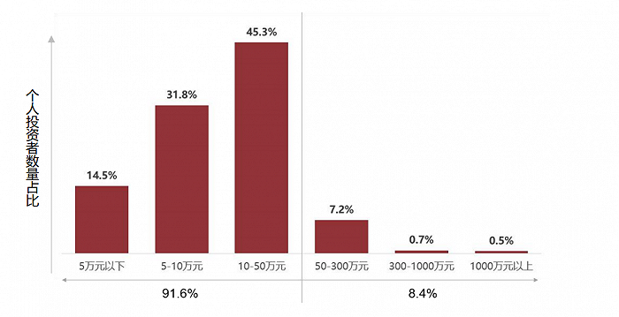 从个人投资者持有的金融资产总规模来看:近七成投资者低于50万元。《调查报告》显示,金融资产总规模超过300万的个人投资者占5.0%;金融资产规模在100万到300万之间的占9.3%,金融资产规模在50到100万之间的占17.4%,以上金融资产超过50万元的个人投资者总计占比31.7%。