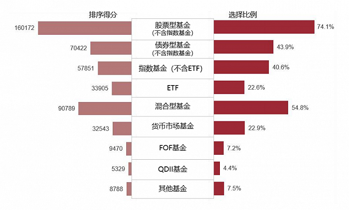 另有22.9%和22.6%的投资者选择货币市场基金和ETF;选择FOF基金、QDII基金、其他基金的比例均不足10%。根据选择顺序综合计算后得到,比起“其他基金”,更多投资者愿意投资FOF基金。