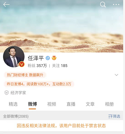 财联社1月12日电,任泽平微博主页显示:因违反相关法律法规,该用户目前处于禁言状态。此前,任泽平曾发表“一定要抓住75-85年这一代还能生的时间窗口”“不要指望90后00后”等言论,引发网友热议。