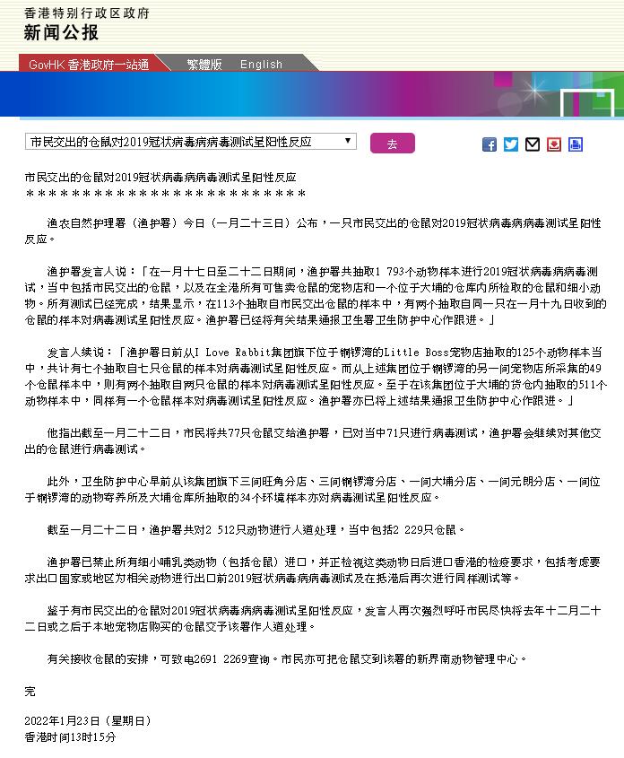财联社1月23日电,据香港特区政府新闻公报,香港渔农自然护理署(渔护署)1月23日公布,一只由市民交出的仓鼠对新冠病毒测试呈阳性反应。香港渔护署发言人说,在1月17日至22日期间,在113个抽取自市民交出仓鼠的样本中,有两个抽取自同一只在1月19日收到的仓鼠的样本对病毒测试呈阳性反应。从I Love Rabbit集团旗下宠物店、货仓采集的仓鼠样本中,共计有10个对病毒测试呈阳性反应。