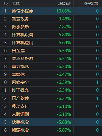 财联社1月27日电,大盘今日全天震荡走低,沪指失守3400点整数关口,创业板指跌超3%。盘面上,所有板块全部下跌,银行、新冠治疗等板块跌幅较少。其中新冠治疗板块午后异动拉升,拓新药业涨超10%,九安医疗、尖峰集团、诚意药业、富祥药业、广生堂等跟涨。下跌方面,题材股普跌数字经济相关板块跌幅居前。总体上今日个股跌多涨少,两市上涨个股不到300只,超4300只个股下跌,跌停及跌幅超10%的个股超100只,今日个股涨幅中位数为-3.1%。沪深两市今日成交额8229亿,较上个交易日放量287亿。板块方面,无任何板块上涨,数字货币、贵金属、旅游、网络安全、国产软件等板块跌幅居前。截止收盘,沪指跌1.78%,深成指跌2.77%,创业板指跌3.25%。北向资金今日全天净卖出146.24亿元,其中沪股通净卖出77.24亿,深股通净卖出69亿。