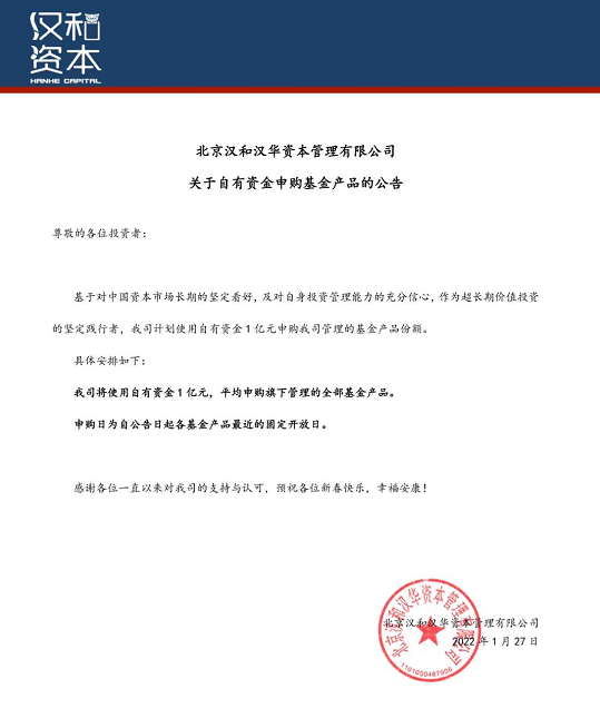 财联社1月27日电,基于对中国资本市场长期的坚定看好,及对自身投资管理能力的充分信心,汉和汉华资本计划使用自有资金1亿元,平均申购管理的全部基金产品份额。(记者 陈俊岭)。