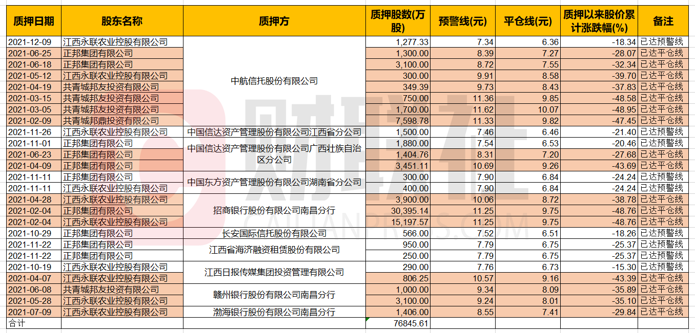 财联社2月9日电,今日正邦科技表示,其控股股东正邦集团与江西铁路航空投资集团有限公司100亿合作协议已开始履约,江西铁路航空投资子公司已为正邦科技代采约8000万元的饲料。公司表示,这将大大缓解正邦的资金需求压力,助力正邦应对持续低迷的市场环境。节后正邦科技股价连续两日跌停,多笔股权质押已达到平仓线。根据东方财富数据统计,16笔质押达到平仓线,25笔质押达到预警线。小财注:江西铁路航空投资集团有限公司是由江西省发改委管理的副厅级全额拨款事业单位。(财联社记者 王平安、张晨静)
