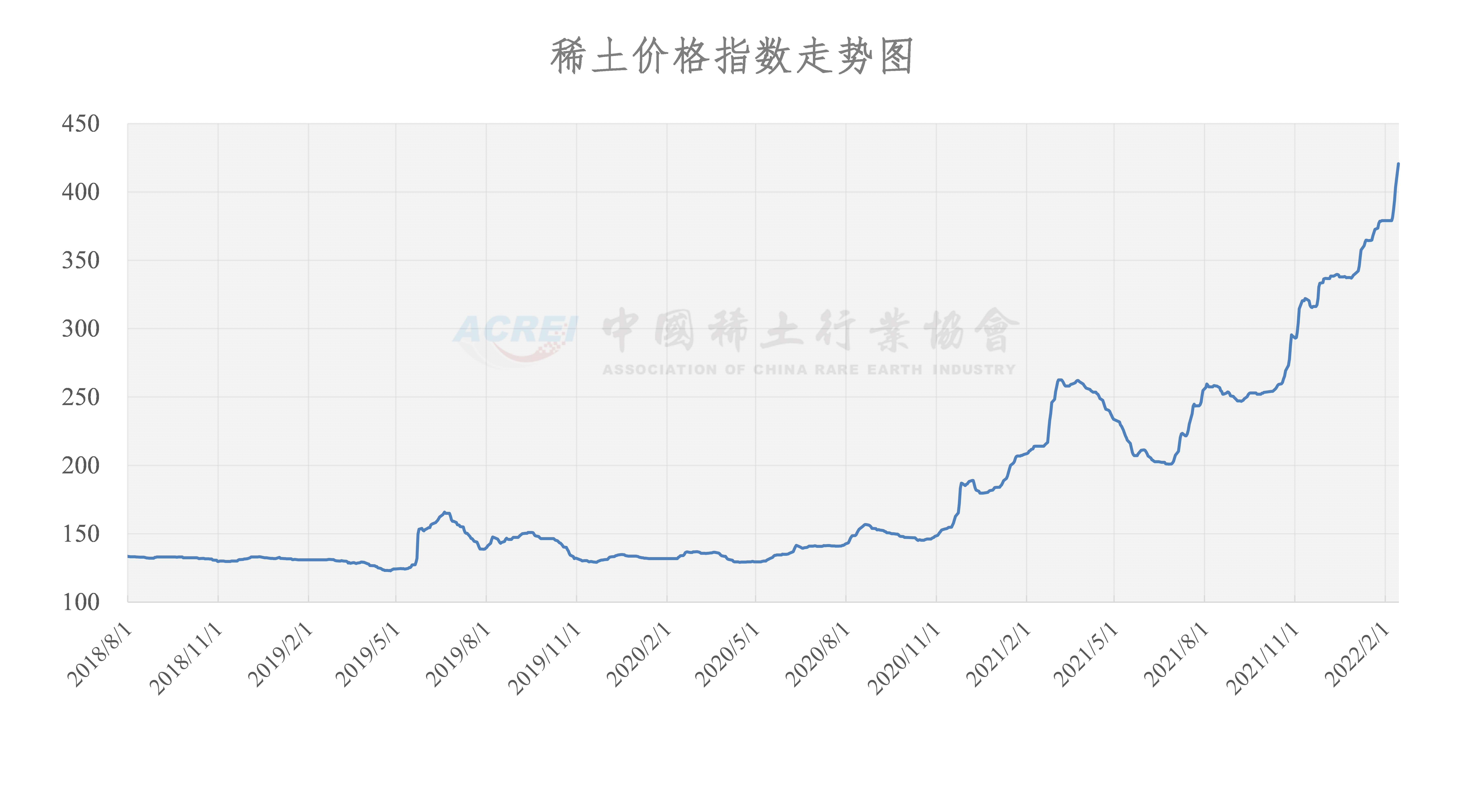 财联社2月14日电,据中国稀土行业协会,2022年02月14日稀土价格指数为420.6,较上周五涨17.1点,续创历史新高。
