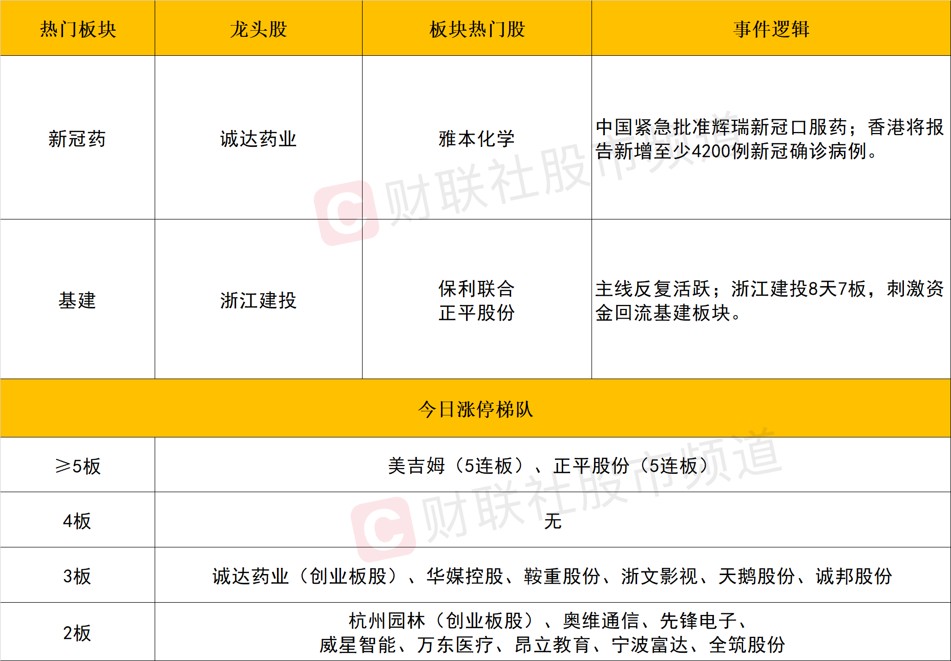 昨日短线情绪低迷,今日就反身高潮。早盘浙江建投快速反包涨停,根据未变的龙头地位、早盘的反包时间、强大的带动效应等条件,浙江建投反包涨停板的质量不错。核心高位股的反包涨停,有两点值得注意:1)龙头股反包当天能否有带动效应。板块跟风股若在龙头反包当天走弱,反而会反噬龙头从而让其在次日有补跌预期。这个失败案例可以参考1月7日湖北广电反包涨停,但当日元宇宙概念股大幅调整,因此湖北广电次日开盘一字跌停进行补跌;2)龙头股反包当天是否主动拉升。比如今日基建股上演涨停潮后,保利联合到尾盘才反包涨停,这个反包涨停板的质量就较一般。创业板高位股方面,诚达药业晋级3连板,该股的赚钱效应很明显往次新股和医药股扩散。截至收盘,三维天地、实朴检测、佳缘科技、华蓝集团、纬德信息等注册制次新股涨停。
