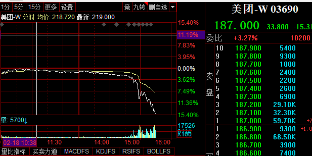 财联社2月18日电,美团跳水,现跌超15%,股价跌破190港元。发改委文件称引导外卖等互联网平台企业进一步下调餐饮业商户服务费标准。