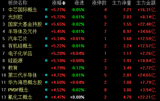 财联社2月23日电,午后指数继续走高,科创50大涨3.98%,两市成交额时隔一个月后再次突破万亿元,赛道股集体迎来反弹,通达信芯片指数涨近4%,光伏指数涨3%,锂电指数涨超2%,而煤炭、油气、地产、金融等周期股调整;盘面上,数字乡村早盘领涨,新冠药概念全天强势,数字基建连板霸榜,午后赛道股继续推升,芯片产业链掀涨停潮,逾20股涨停或涨超10%,光伏、储能、锂电股轮番拉涨均有所表现;总体来看,今日赚钱效应较好,两市约3500只个股上涨,高标股方面,宁波建工6连板,真视通、依米康、佳力图、浙农股份、美利云、黑牡丹、浙大网新、直真科技、贵广网络等4连板;板块方面,光刻胶、半导体及元件、汽车芯片、硅能源涨幅居前,贵金属、玉米、油气开采等跌幅前列。截止收盘,沪指涨0.93%,深成指涨1.9%,创业板指涨2.82%。北向资金全天净买入14.22亿元,其中沪股通净买入9.26亿元,深股通净买入4.96亿元。