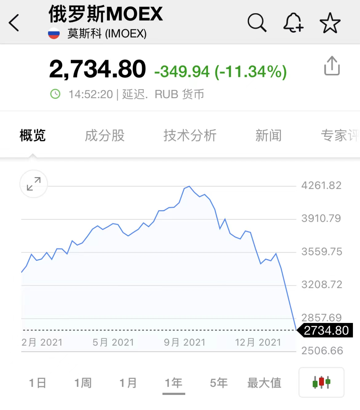 财联社2月24日电,俄罗斯MOEX指数下跌11.32%。此前,乌克兰驻联合国代表表示,俄罗斯驻联合国代表已证实,俄罗斯总统普京对乌克兰宣战。