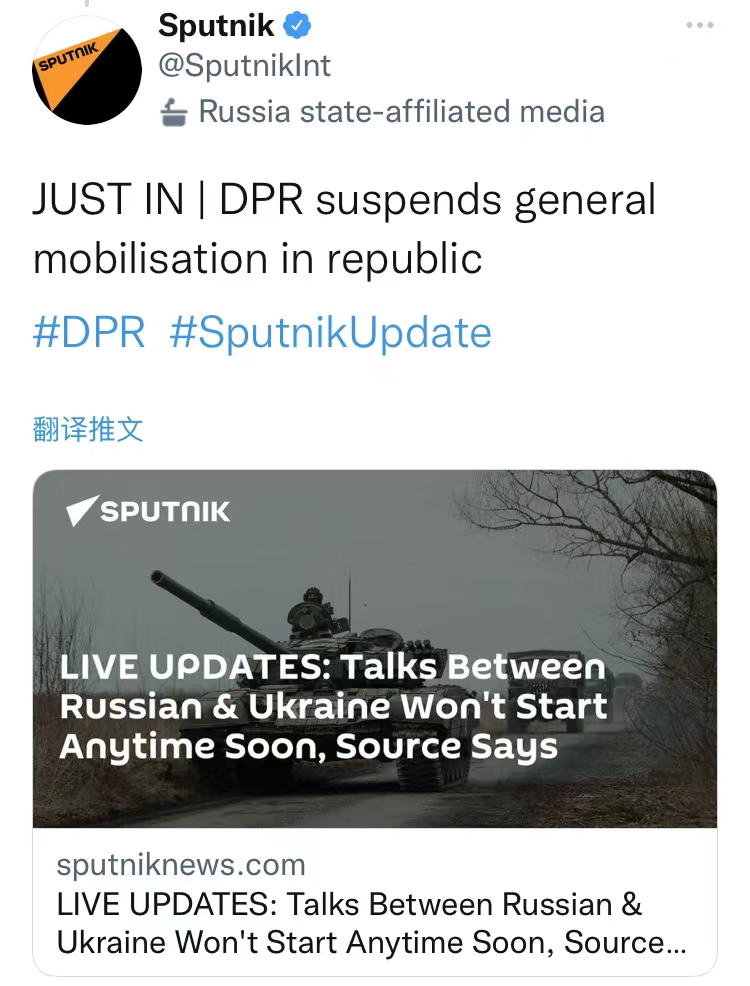 财联社2月28日电,乌克兰东部“顿涅茨克人民共和国”方面表示,已经暂停“全国”动员。 (卫星新闻)