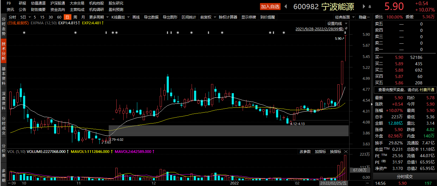 财联社2月28日电,宁波能源公告,公司与宁波奉化区政府、华勘院签订了《宁波奉化抽水蓄能电站项目投资建设合作意向书》,共同科学、有序开发建设宁波奉化抽水蓄能电站项目,项目装机规模约120万千瓦,投资估算约80亿元。小财注:截至今日收盘,宁波能源录得三连板。