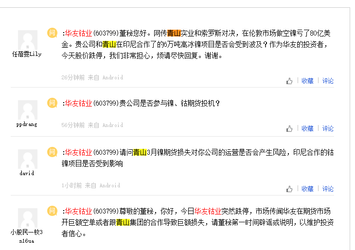 多位华友钴业投资者在互动平台提问与青山控股关系 董秘暂未回应