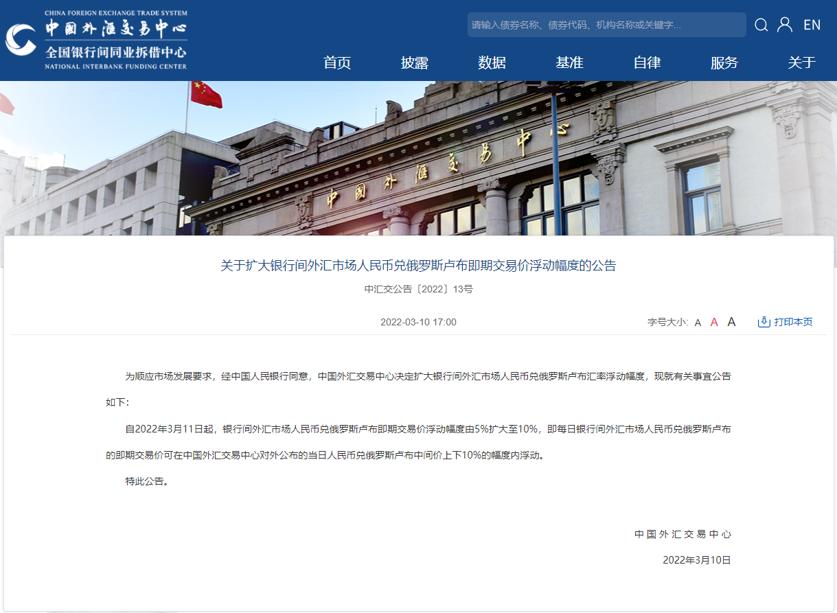 财联社3月10日电,中国外汇交易中心发布通知,自2022年3月11日起,银行间外汇市场人民币兑俄罗斯卢布即期交易价浮动幅度由5%扩大至10%,即每日银行间外汇市场人民币兑俄罗斯卢布的即期交易价可在中国外汇交易中心对外公布的当日人民币兑俄罗斯卢布中间价上下10%的幅度内浮动。