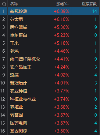 财联社3月11日电,大盘午后V型反弹,三大指数全线翻红,创业板指领涨。盘面上,新冠检测概念股午后再度爆发,板块掀涨停潮。券商板块盘中异动拉升带动指数快速反弹,中银证券、华林证券涨停。电子身份证概念股异动拉升,创业板股雄帝科技涨停。总体上个股涨多跌少,两市超2800只个股上涨。沪深两市今日成交额10502亿,较上个交易日缩量285亿。板块方面,新冠检测、农产品、新冠治疗、辅助生殖等板块涨幅居前,油气开采、托育服务、贵金属、电力、建筑装饰等板块跌幅居前。截止收盘,沪指涨0.41%,深成指涨0.62%,创业板指涨1.15%。北向资金全天净卖出50.42亿元,其中沪股通净卖出31.42亿元,深股通净卖出19亿元。