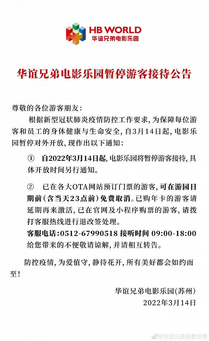 财联社3月14日电,据华谊兄弟电影世界 消息,3月14日,华谊兄弟电影乐园(苏州)发布公告:自2022年3月14日起,电影乐园将暂停游客接待,具体开放时间另行通知。