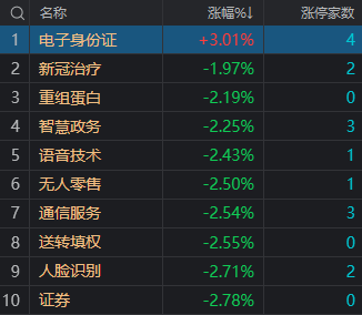 财联社3月15日电,大盘全天震荡走低,上证指数领跌。盘面上,电子身份证概念股全天强势,创业板股远方信息涨停2连板,南威软件3连板。除此之外其余板块全部下跌,周期类板块连续两日大跌,中国石油跌近8%。总体上个股跌多涨少,两市超4400只个股下跌,上涨个股不足300只,超百股跌停。沪深两市今日成交额11243亿,较上个交易日放量1613亿。板块方面,仅电子身份证一个板块上涨,煤炭、贵金属、油气开采、钢铁、燃气等板块跌幅居前。截止收盘,沪指跌4.95%,深成指跌4.36%,创业板指跌2.55%。北向资金全天净卖出160.24亿元,连续两日净卖出超百亿,其中沪股通净卖出88.64亿元,深股通净卖出71.61亿元。