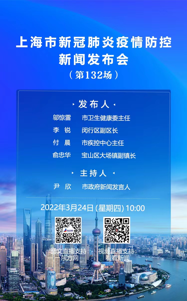 今天10:00,上海将举行新冠肺炎疫情防控工作新闻发布会(第132场),邀请上海市卫生健康委主任邬惊雷、闵行区副区长李锐、市疾控中心主任付晨、宝山区大场镇副镇长俞忠华,介绍上海最新情况。