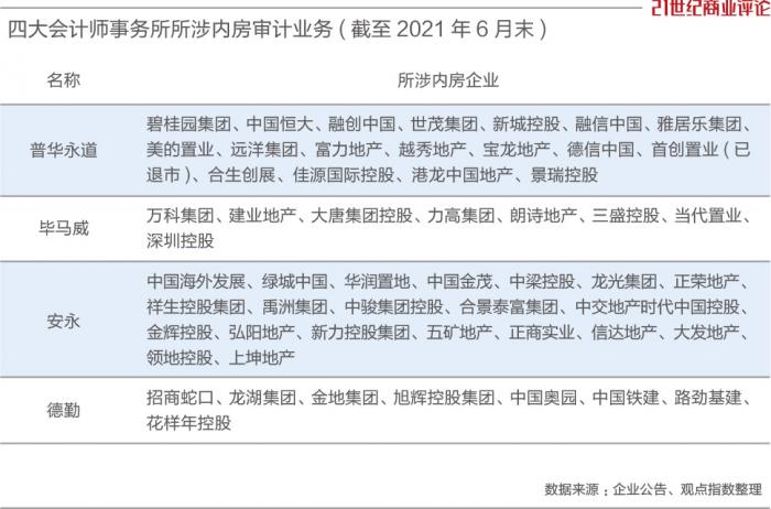 截至2021年上半年,安永为22家头部内资房企提供审计服务,普华永道与18家达成合作,毕马威和德勤分别是8家。