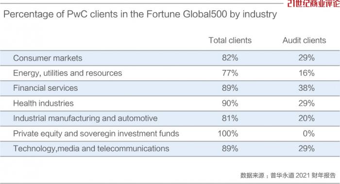 普华永道2021财年报告显示,其审计服务面向的客户中,金融服务行业占了38% ,健康行业占了29%,技术、媒体以及电信行业占了29%,未提及房地产行业。