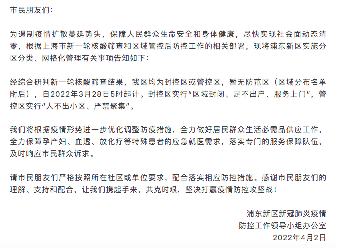 财联社4月2日电,浦东新区新冠肺炎疫情防控工作领导小组办公室发布消息,为遏制疫情扩散蔓延势头,保障人民群众生命安全和身体健康,尽快实现社会面动态清零,根据上海市新一轮核酸筛查和区域管控后防控工作的相关部署,现将浦东新区实施分区分类、网格化管理有关事项告知如下:经综合研判新一轮核酸筛查结果,我区均为封控区或管控区,暂无防范区(区域分布名单附后),自2022年3月28日5时起计。封控区实行“区域封闭、足不出户、服务上门”,管控区实行“人不出小区、严禁聚集”。