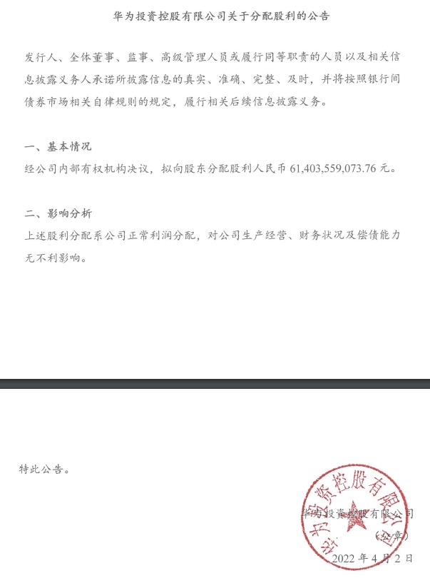 财联社4月2日电,据上海清算所4月2日消息,华为投资控股有限公司发布公告称,经公司内部有权机构决议,拟向股东分配股利人民币61,403,559,073.76元。