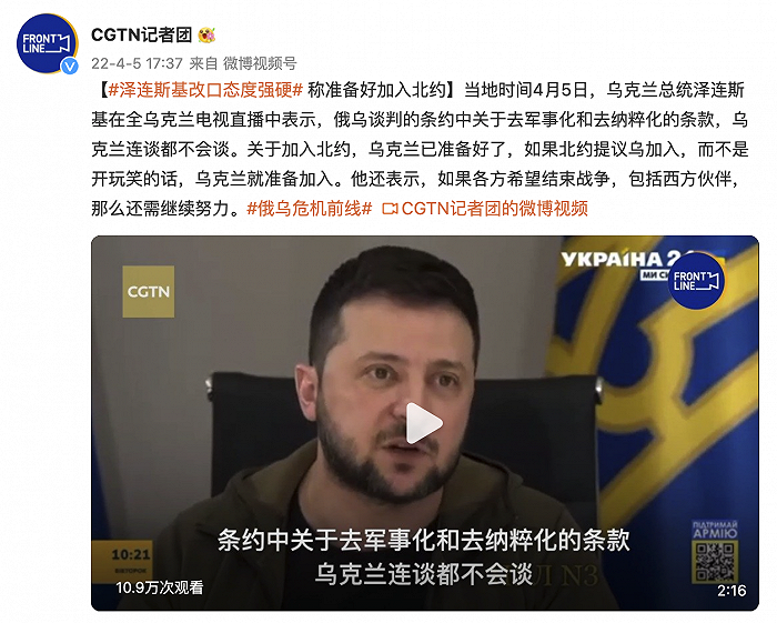 财联社4月5日电,据@CGTN记者团消息,当地时间4月5日,乌克兰总统泽连斯基在全乌克兰电视直播中表示,俄乌谈判的条约中关于去军事化和去纳粹化的条款,乌克兰连谈都不会谈。关于加入北约,乌克兰已准备好了,如果北约提议乌加入,而不是开玩笑的话,乌克兰就准备加入。他还表示,如果各方希望结束战争,包括西方伙伴,那么还需继续努力。