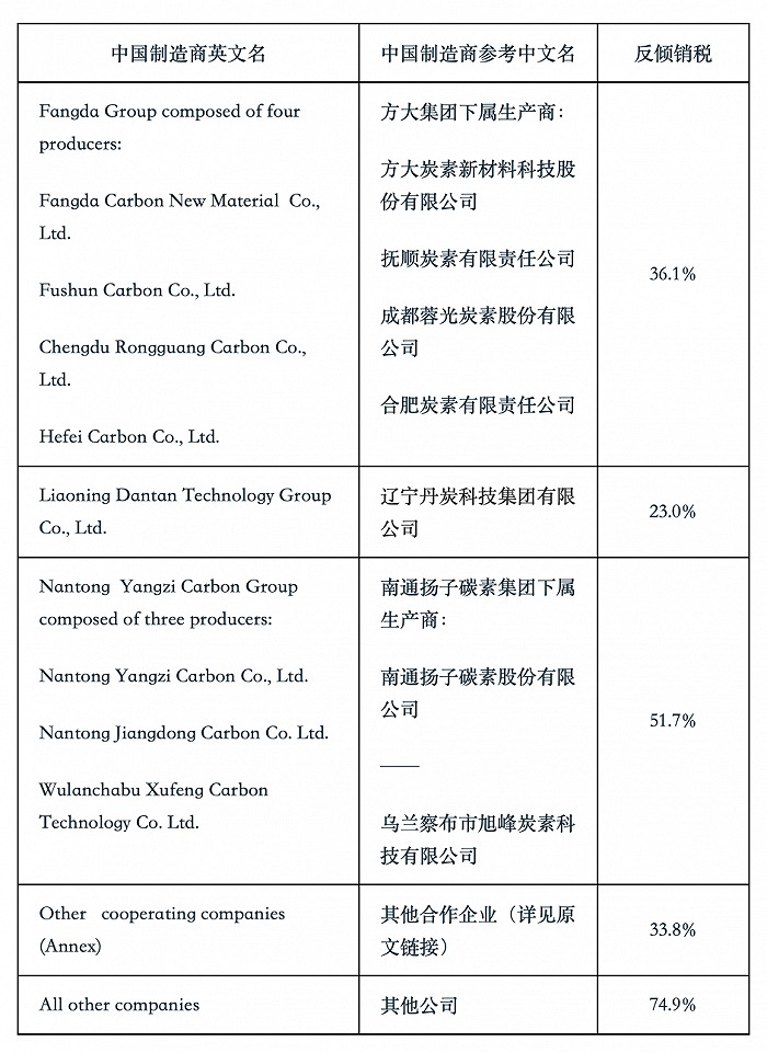 财联社4月8日电,据中国贸易救济信息网,4月7日,欧盟委员会发布公告,对原产于中国的石墨电极系统作出反倾销肯定性终裁,决定自公告发布次日起对涉案产品征收23.0%~74.9%的反倾销税。本案倾销和损害调查期为2020年1月1日~2020年12月30日,损害调查期为2017年1月1日至倾销和损害调查期结束。