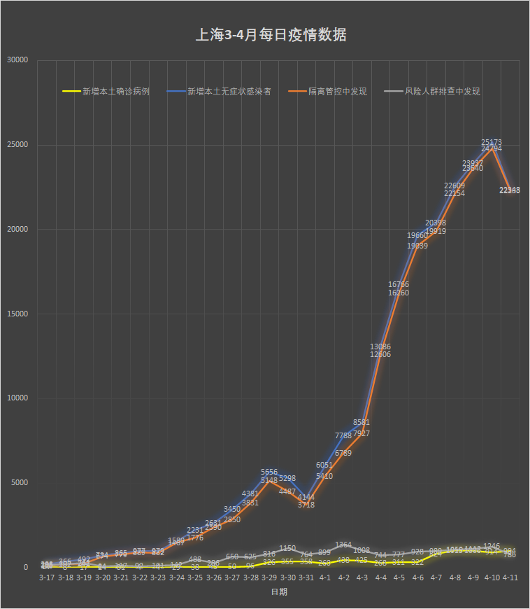 财联社4月12日电,①上海市卫健委今早(12日)通报:2022年4月11日0—24时,上海新增本土新冠肺炎确诊病例994例和无症状感染者22348例,其中273例确诊病例为此前无症状感染者转归,439例确诊病例和21844例无症状感染者在隔离管控中发现,其余在相关风险人群排查中发现。
