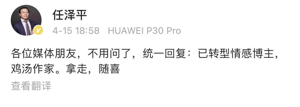 财联社4月15日讯,财联社前日报道“任泽平3月份就不再担任东吴证券特邀首席经济学家”,其个人未来发展规划受到市场关注。任泽平今日在个人微博上发声,调侃自己“已转型情感博主、鸡汤作家”。(记者 刘超凤)