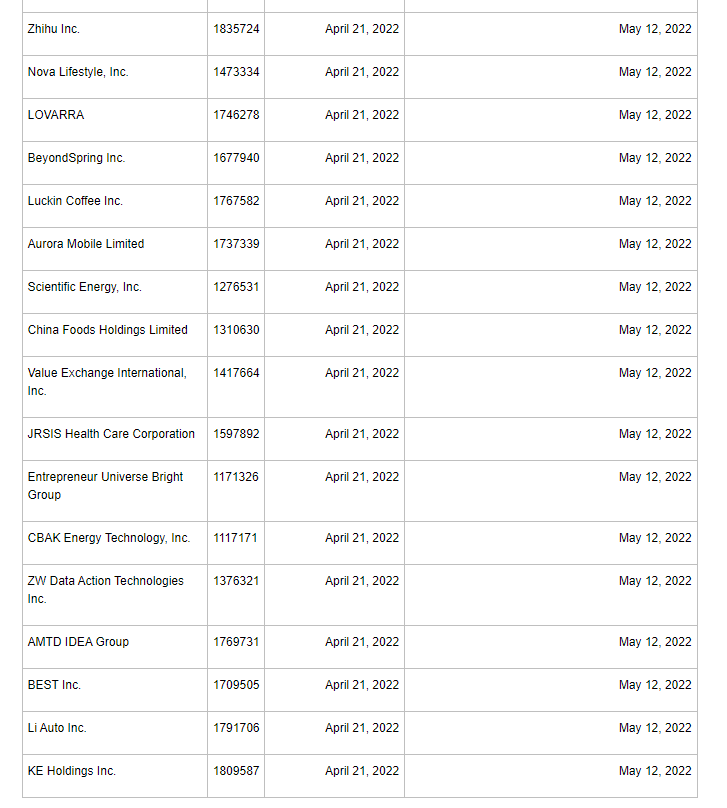 财联社4月22日电,美国证劵交易委员会(SEC)当地时间4月21日再将理想汽车、百世集团和贝壳等公司加入“预摘牌”名单,这是自3月以来第五批被纳入名单的中概股公司。具体名单为:知乎、诺华家具、LOVARRA、万春医药、瑞幸咖啡、极光、Scientific Energy、中国食品、Value Exchange International、泽尔西西医疗集团、Entrepreneur Universe Bright Group、中比能源、中网载线、尚乘国际、百世集团、理想汽车和贝壳。SEC声称,上述17家公司提交申辩的截止时间为当地时间5月12日。
