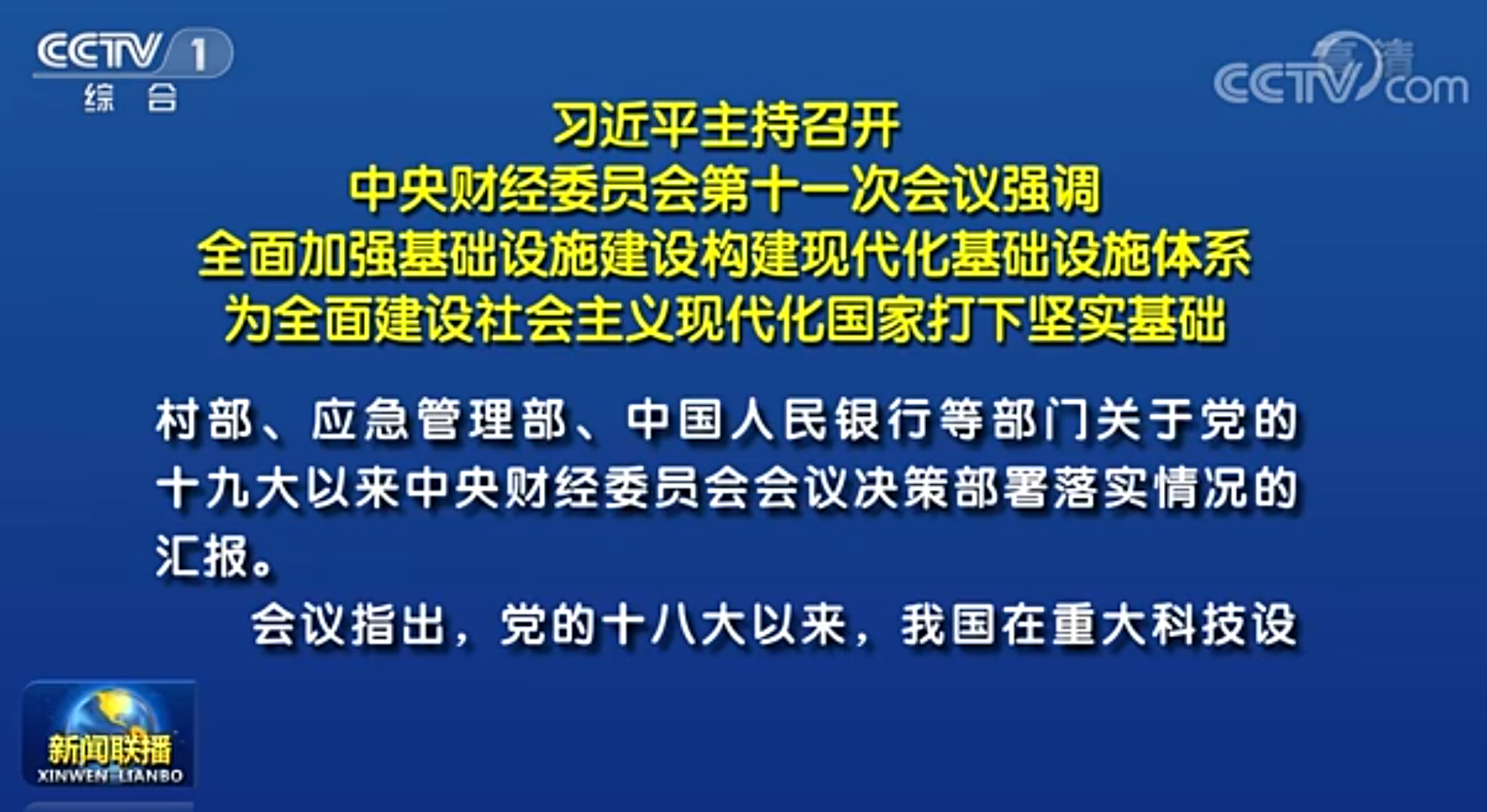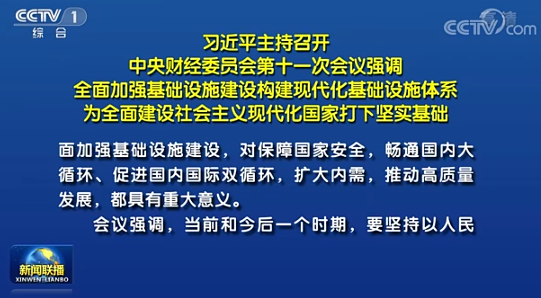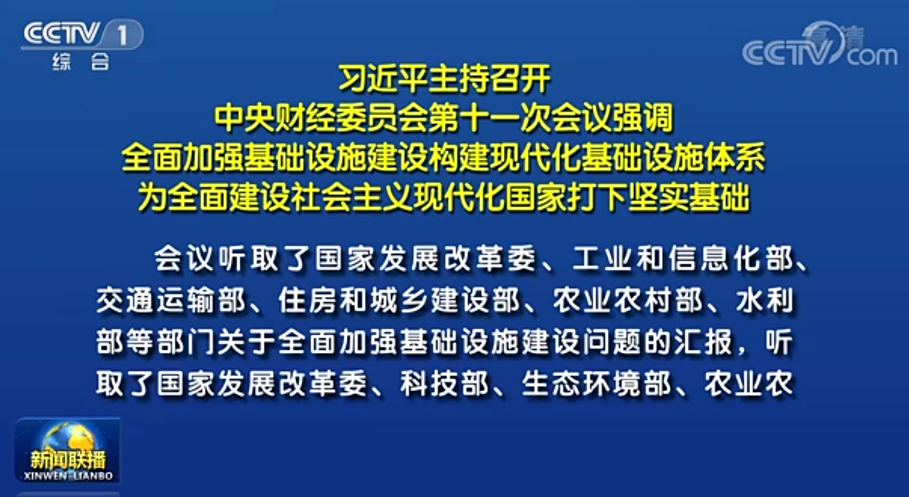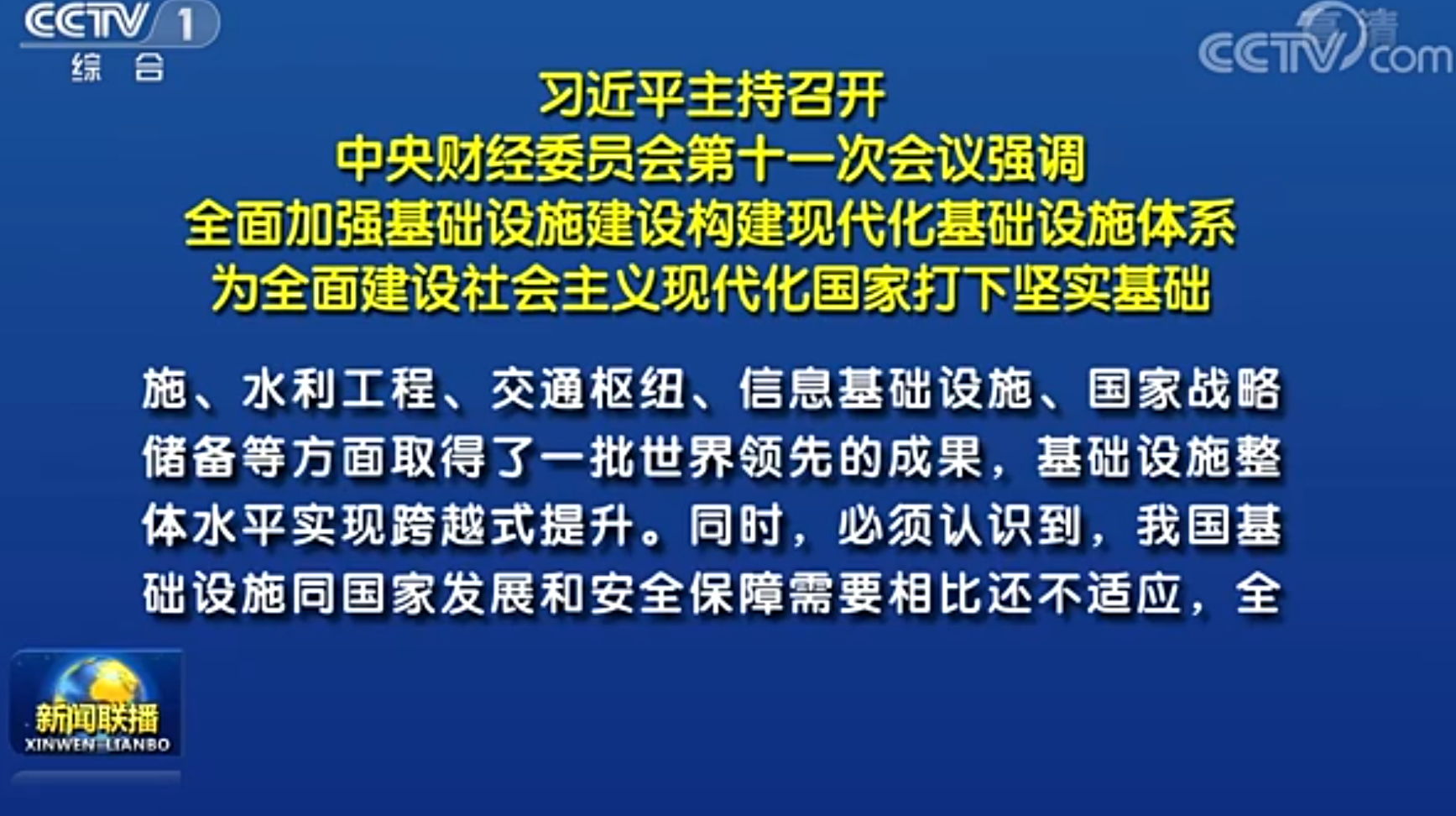 财联社4月26日电,中共中央总书记、国家主席、中央军委主席、中央财经委员会主任习近平4月26日主持召开中央财经委员会第十一次会议,研究全面加强基础设施建设问题,研究党的十九大以来中央财经委员会会议决策部署落实情况。习近平强调,基础设施是经济社会发展的重要支撑,要统筹发展和安全,优化基础设施布局、结构、功能和发展模式,构建现代化基础设施体系,为全面建设社会主义现代化国家打下坚实基础;中央财经委员会是党中央领导经济工作的重要制度安排,各地区各部门要准确领会中央财经委员会决策部署精神,共同推动决策部署落实落好。会议指出,党的十八大以来,我国在重大科技设施、水利工程、交通枢纽、信息基础设施、国家战略储备等方面取得了一批世界领先的成果,基础设施整体水平实现跨越式提升。同时,必须认识到,我国基础设施同国家发展和安全保障需要相比还不适应,全面加强基础设施建设,对保障国家安全,畅通国内大循环、促进国内国际双循环,扩大内需,推动高质量发展,都具有重大意义。 (新闻联播)