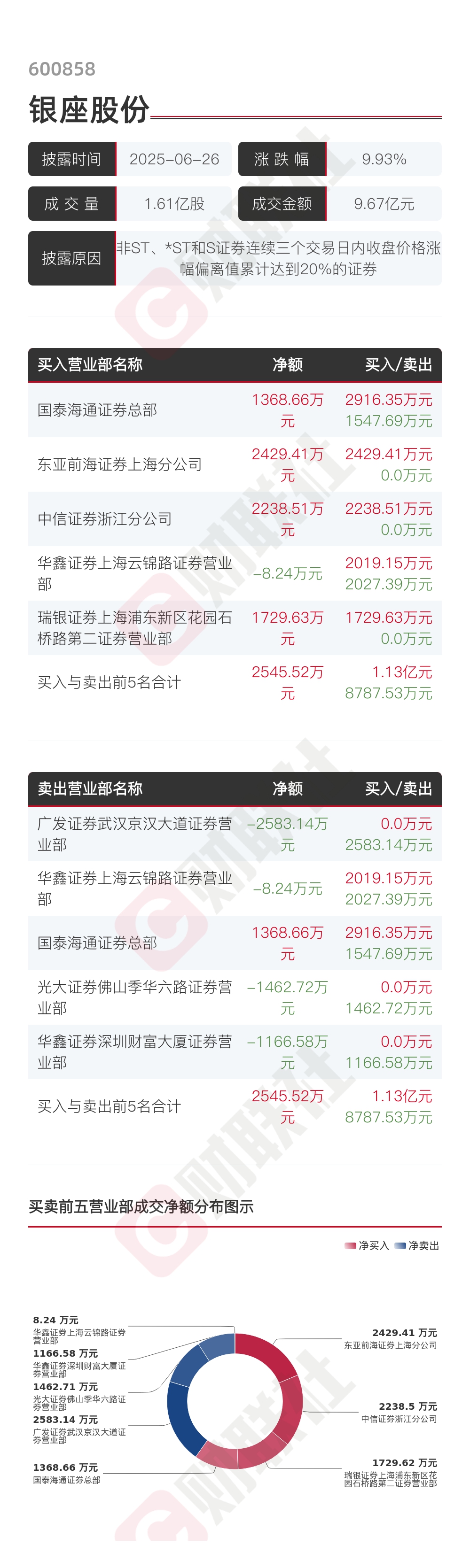 【龙虎榜】银座股份 6月26日成交明细