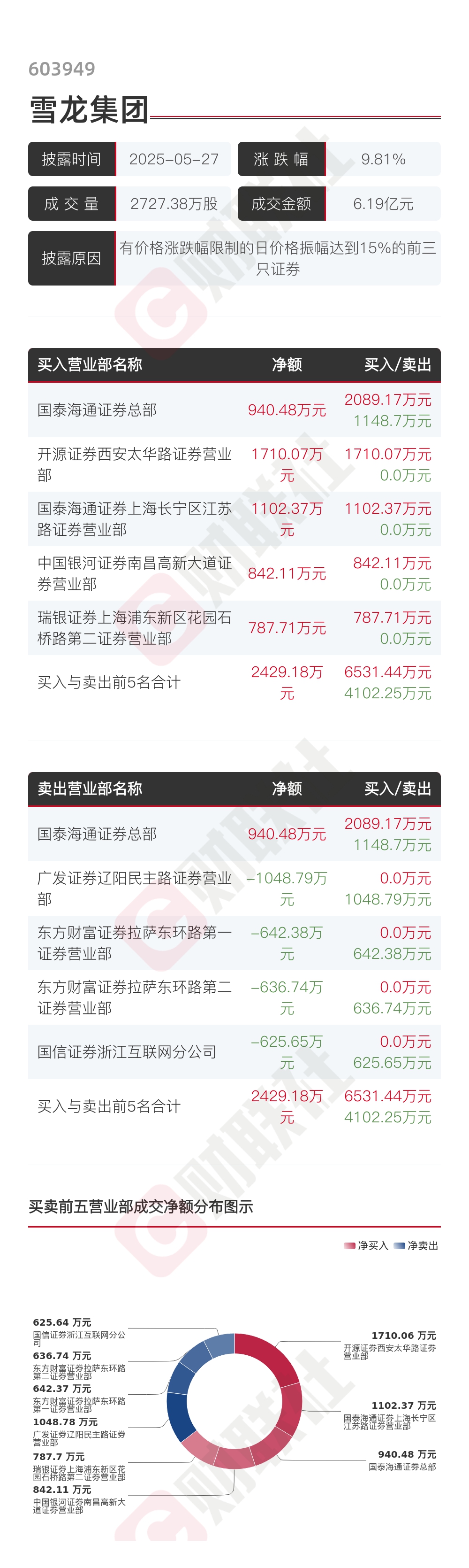 【龙虎榜】雪龙集团 5月27日成交明细