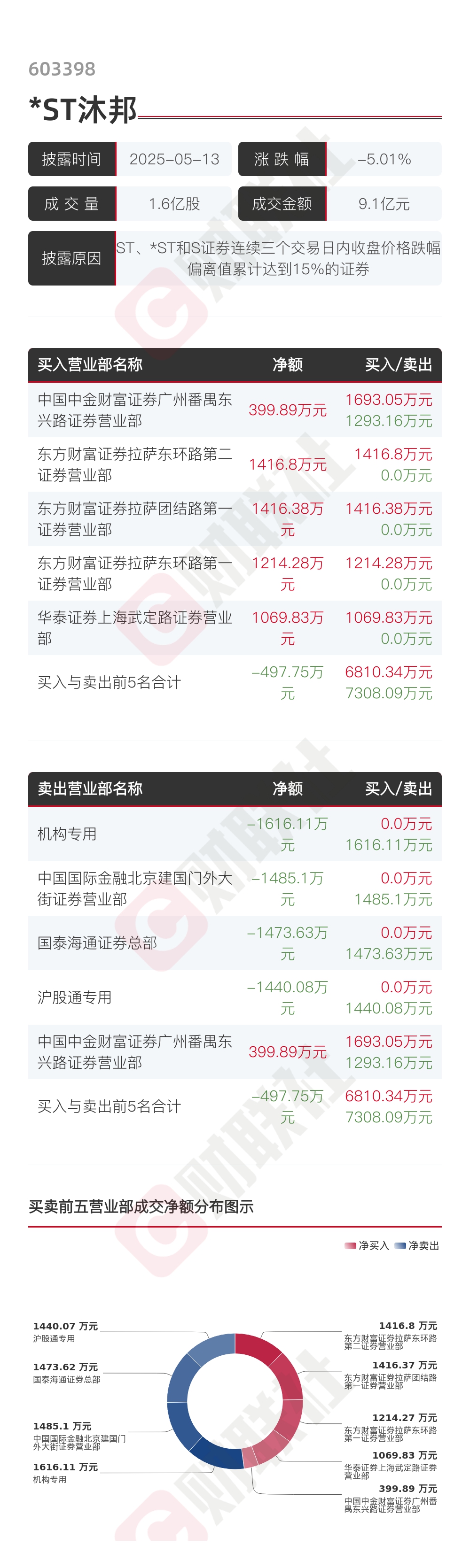 【龙虎榜】*ST沐邦 5月13日成交明细