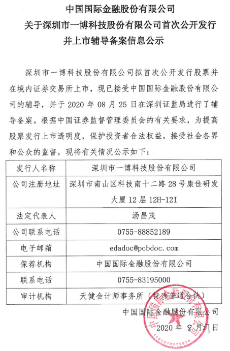 集微网消息 9月2日,深圳监管局披露了中金公司关于深圳市一博科技股份有限公司(以下简称为“一博科技”)首次公开发行并上市辅导备案信息。